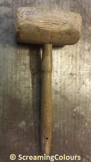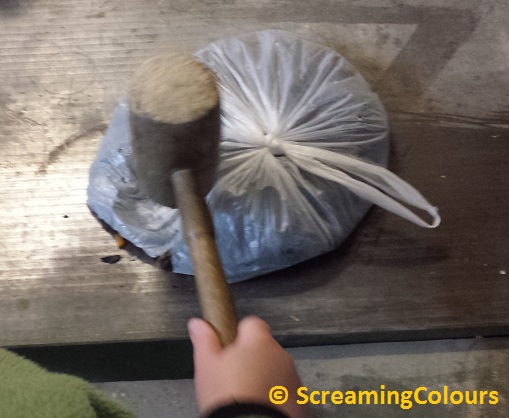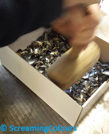 Die Muschelschalen haben wir einfach in einen Plastiksack gegeben und mit dem Hammer in möglichst kleine Stücke zertrümmert. Nach kurzer Zeit ist das Sackerl jedoch gerissen (was auch zu erwarten war, aber ich hatte keine Lust auf herumfliegende Muschelteile 🙂 ). Danach haben wir die Muschelschalen in einem Karton ausgebreitet und mit dem Holzhammer nochmal etwas kleingedrückt.