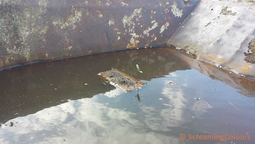 Vor ein paar Tagen haben wir auf unserem Hof ein etwas surreales Bild entdeckt. In diesem Muldenkipper treibt ein kleines Holzstück auf dem ein Pflänzchen einen neuen Lebensraum gefunden hat. Das kleine Brett schwimmt da munter im Wasser hin und her und lässt sich weder von Wind noch von Wetter irritieren.