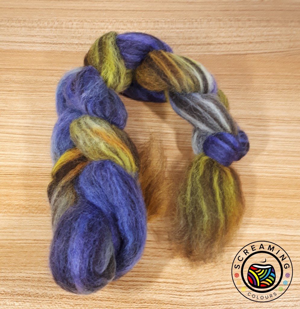 Wie auch die letzten beiden Spinnprojekte Eis und Schnee und Bratapfel stammt auch dieser Kammzug wieder aus meinen eigenen Färbetöpfen. Sie waren meine ersten Färbeversuche auf Kammzügen. Für diese Färbung habe ich mir einen Kammzug aus 100% Corriedale-Fasern ausgesucht. Das Besondere hierbei war, dass der Kammzug nicht reinweiß war. Drei verschiedene Naturfarben dieser tollen Schafrasse wurden in diesem Kammzug zusammen gemischt. Gefärbt und versponnen ergibt das eine schöne Melierung im Garn