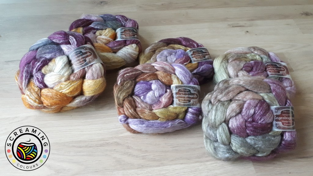Die Rede ist von einem Combospin. Dafür sucht man sich mehrere unterschiedliche Kammzüge oder andere Faseraufbereitungen zusammen, zerpflückt diese in kleine Abschnitte und mischt sie durcheinander. Anschließend werden die Abschnitte einfach querbeet nacheinander weggesponnen. Am Ende verzwirnt man die so entstandenen Fäden miteinander und bekommt ein tolles Farbspiel.
