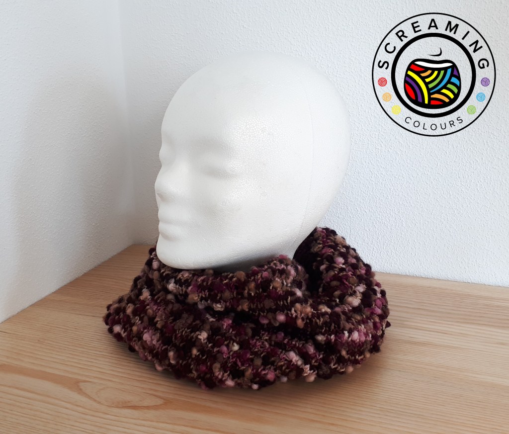Effektgarne wie dieses Noppengarn wirken am besten, wenn sei einfach glatt rechts gestrickt werden. Jegliches zusätzliche Muster würde bei diesem Garn ohnehin nicht wirken, da es unter den Noppen verschwinden würde. Und so habe ich diesen Cowl so gestaltet, dass die ColourSlub ihre Schönheit komplett entfalten kann.