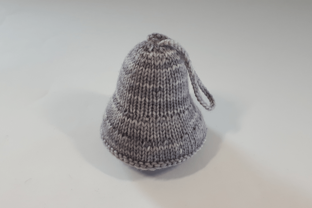 Nachdem auf diese Art 3 von 4 Nadeln der beiden Nadelspiele abgestrickt wurden, wird die Glocke ausgestopft. Am Ende den Faden abschneiden und alle Fäden vernähen.