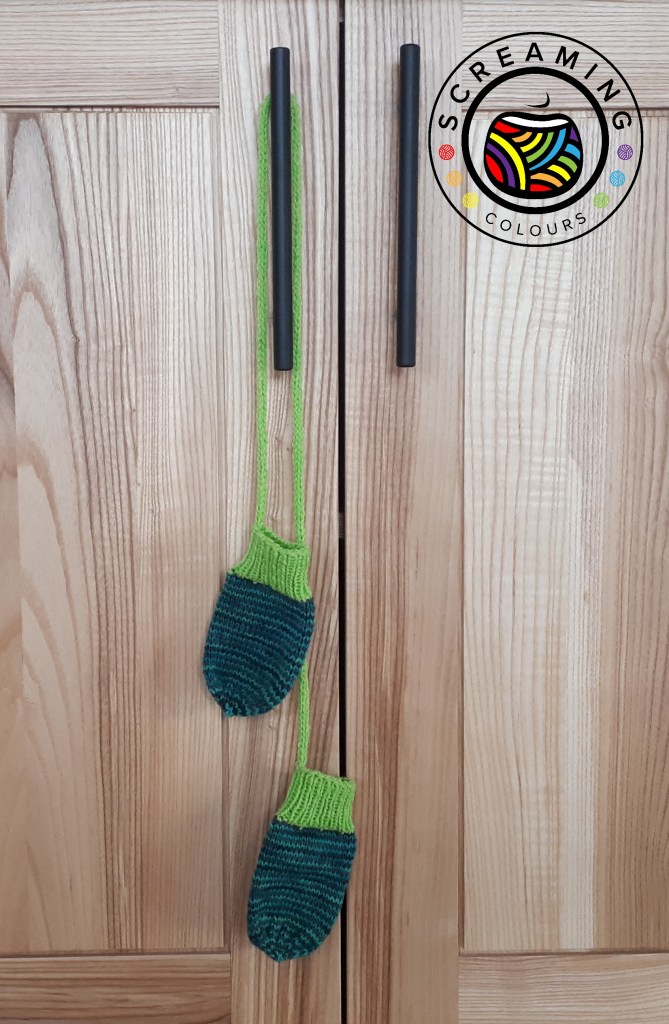 Das Bündchen und die Icord-Schnur habe ich mit der Farbe Gelbgrün gestrickt. Die Handschuhe selbst dann abwechselnd eine Reihe in Schwarz und eine Reihe in der Färbung Lagune. Von der Lagune hatte ich noch genau 6g übrig, bevor ich die Handschuhe zu stricken begonnen habe. Da war mir schon klar, dass das echt knapp wird. Und zum Schluss wurde es wirklich spannend. Bei jeder Runde kam das Ende sichtlich näher. Ich habe also wieder einmal eine Runde Yarn Chicken gespielt.