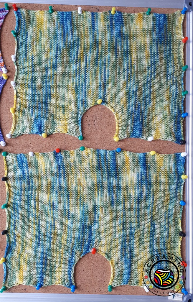 Momentan liegt es noch auf der Streckbank – äh Spannmatte. Die Einzelteile mussten nämlich erstmal ein wenig in Form gebracht werden. Das erleichtert dann das Zusammennähen. Danach fehlen nur noch die Bündchen oben und an den Beinen und schon ist das gute Teil fertig. Das ist echt ein flottes Projekt.