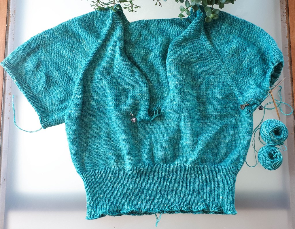 An meinem Smaragd Cardigan ist diesen Monat leider nur sehr wenig passiert. Er wurde doch von dem neuen Projekt überschattet. Nichtsdestotrotz sind nun beide Ärmel fertig. Jetzt muss der Cardigan nur noch ein wenig in der Länge wachsen. Das passiert dann bestimmt im August. Ich möchte den Cardi nämlich gerne anziehen. 🙂