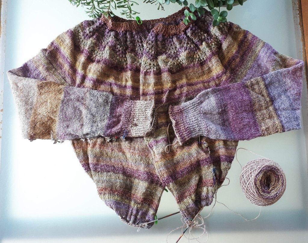 Die tolle Anleitung für diesen Cardigan ist von der ukrainischen Designerin Svetlana Volkova. Du findest die Anleitung hier. Das hübsche Garn ist von mir selbstgesponnen. Ich habe bereits in einem eigenen Blogbeitrag darüber berichtet. Die Rede ist von meinem Combospin Lila-Gelb.