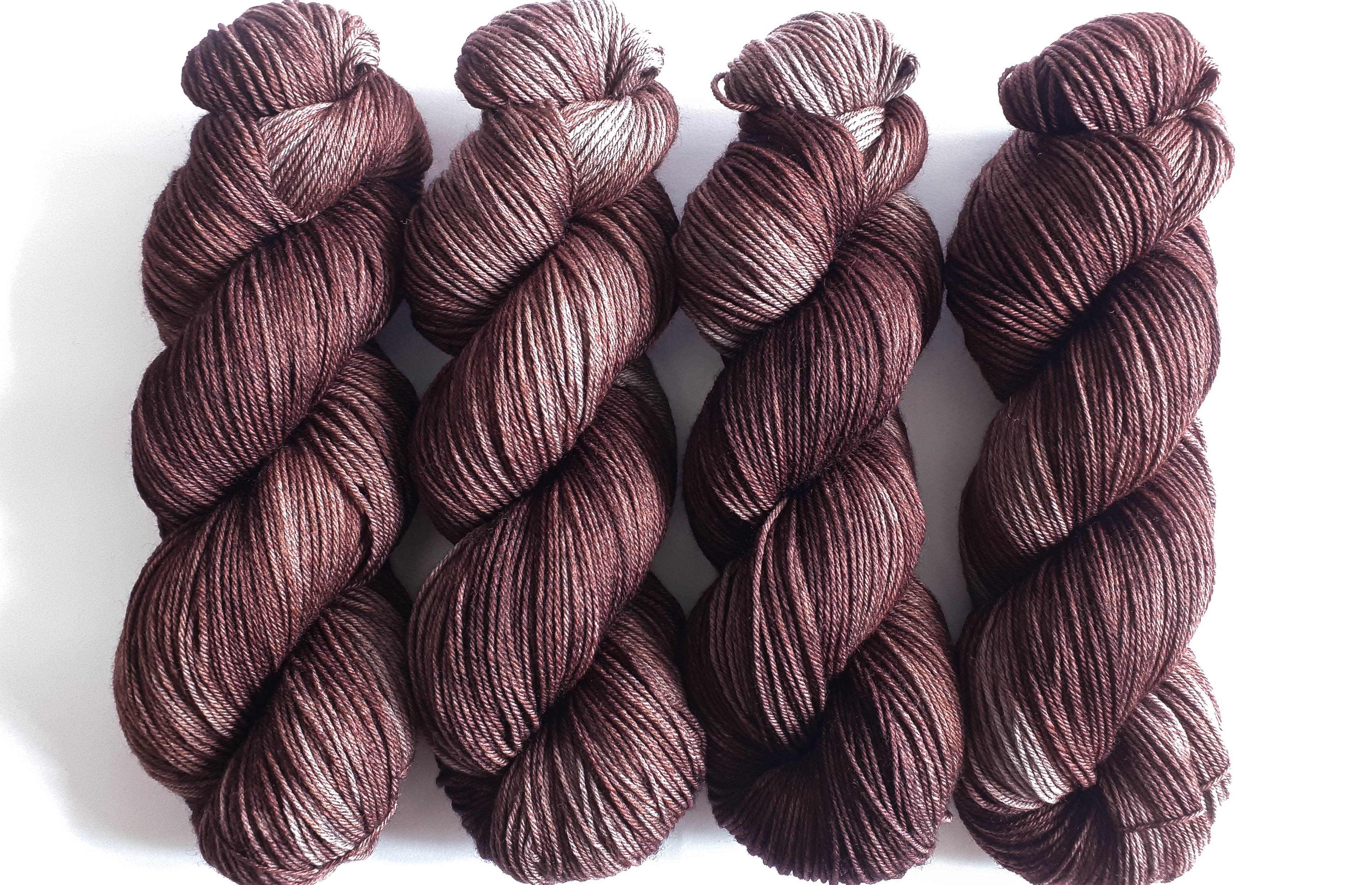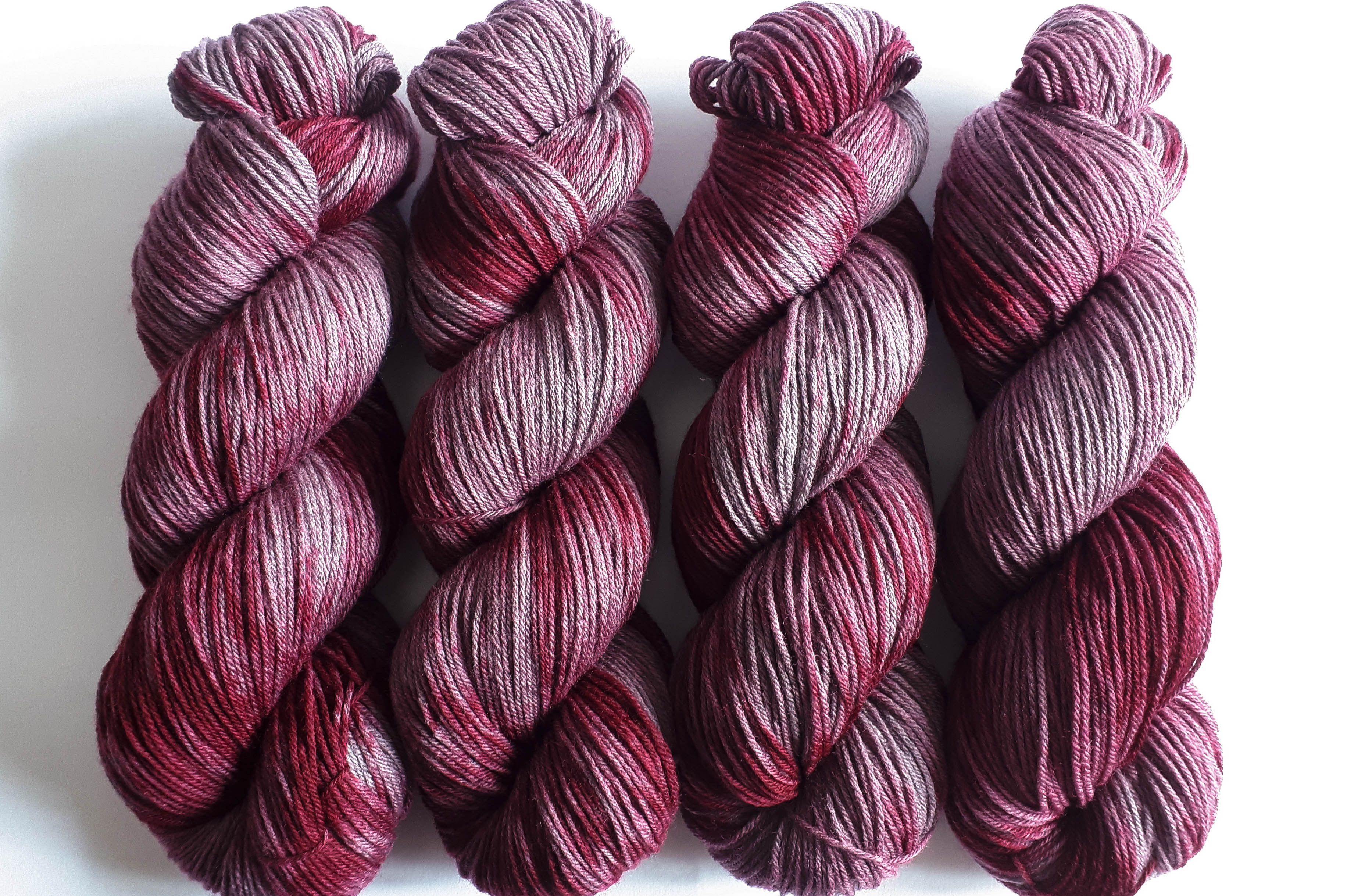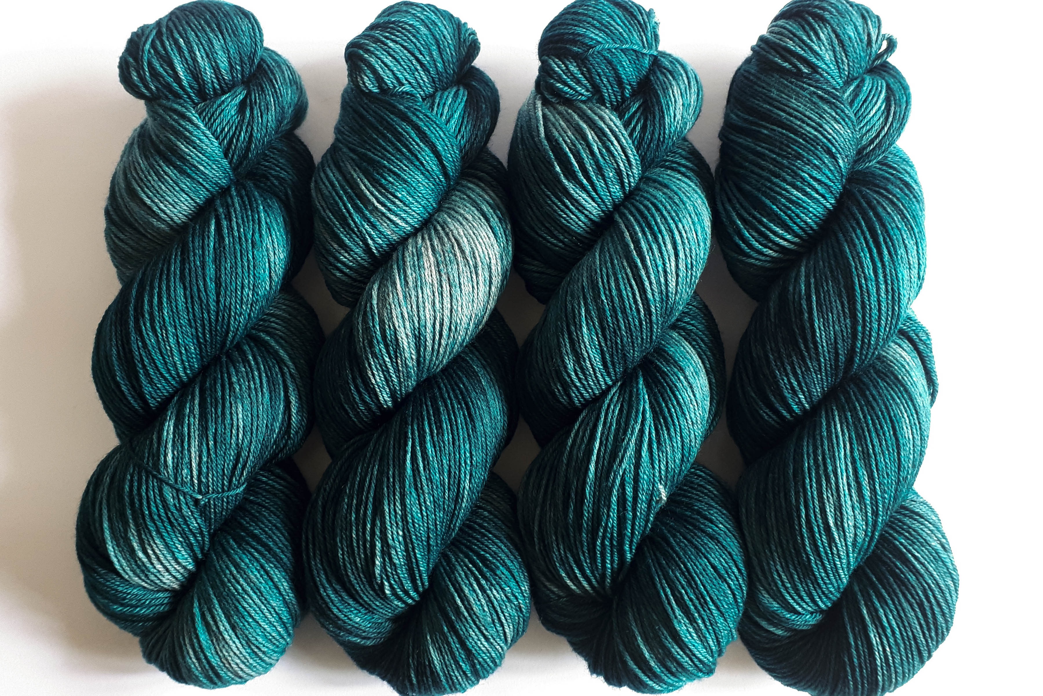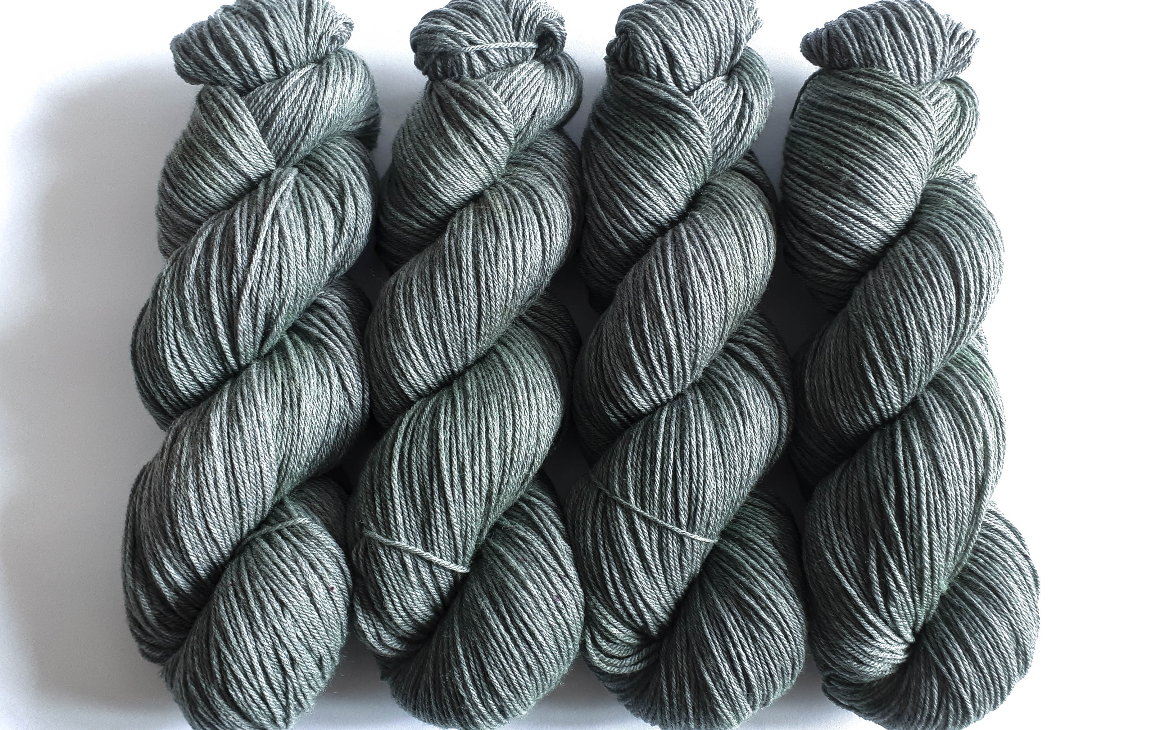 Genauer gesagt eine neue Garnbasis, die vorerst in die Specials einzieht. Sie heißt ColourMelange und ist vom Aufbau her wie die ColourHighTwist, nur mit dem Unterschied, dass sie meliert ist. Dafür wird in einem Zwischenschritt der Polyamid-Anteil eingefärbt, bevor er mit dem Merino extrafine gemischt und zu dem feinen weichen Garn versponnen wird. Handgefärbt ergibt sich so eine spannende Farbwelt, die natürlich abgedämpfter und etwas dunkler ist als wenn sie auf weißem Rohgarn gefärbt wird. So ergeben sich aber ganz andere spannende Farbnuancen. Zum Ausprobieren habe ich nun mal 5 verschiedene Farben für dich gefärbt. Wenn du die ColourMelange gerne magst, zieht sie auch langfristig in den Shop ein. Wenn sie sich nicht so gut verkauft, dann kommt davon auch nicht mehr. Du siehst, du hast das auch mit in der Hand. 🙂