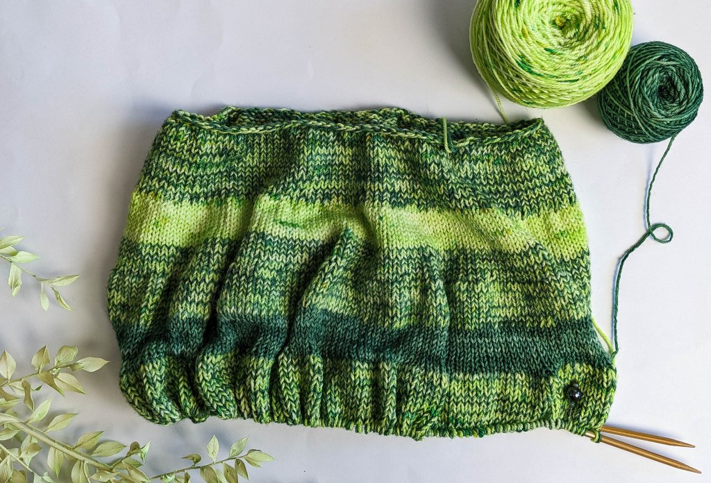 Ich stricke den Stripey Sweater aus einer Kombi der ColourYak in Waldgrün und der ColourRamie in Springfeeling.