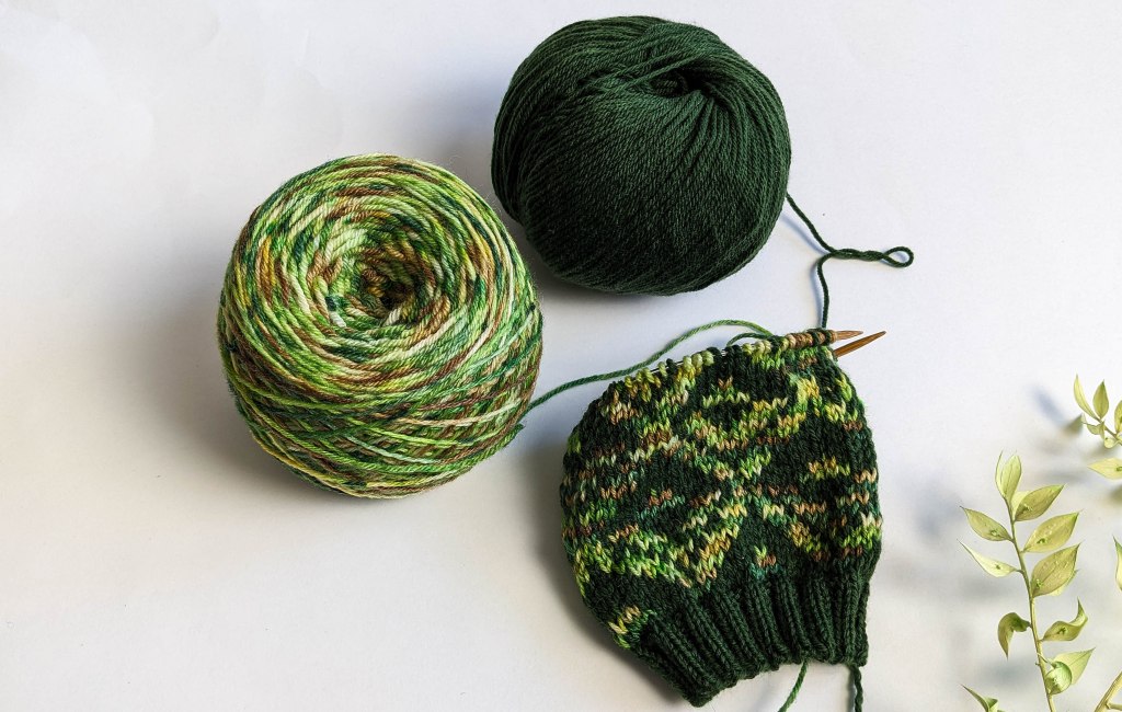 Die Socken stricke ich aus einem Strang ColourBalance Gurkenernte und einem Knäuel HighTwist Concept Uni in Fb. Nr. 148.