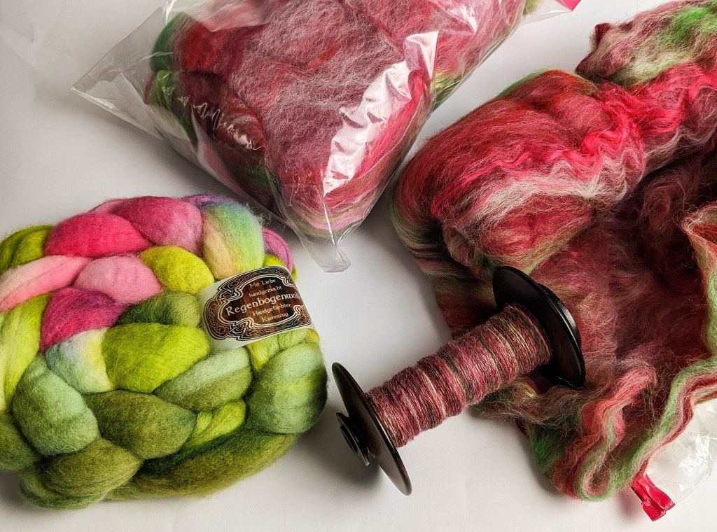 Und da mein Spinnrädchen dann leer war, habe ich mir natürlich sofort ein passendes weiteres Projekt ausgesucht. Hierzu bin ich in die Tiefen meines Spinnfaser-Stashs abgetaucht und wurde schnell fündig. Geworden sind es zum einen zwei Batts, die ich einmal aus einem Tauschpaket in der Regenbogenwolle-Ravelrygruppe herausgefischt habe, mit dem passenden Namen Batts of Roses.