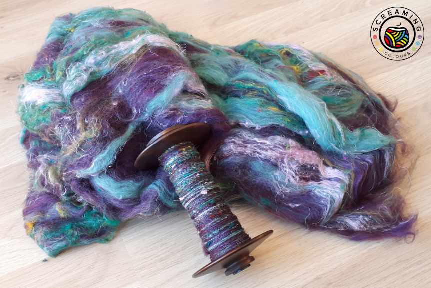 So durfte ich mir ein wunderschönes Batt bei der lieben Sofie aussuchen. Ich habe mich für ein schön texturiertes Batt entschieden in Lilatönen, das unter anderem auch Sariseide enthalten hat. Ich liebe Sariseide sehr, weil es dem handgesponnenen Garn so schön Textur verleiht.