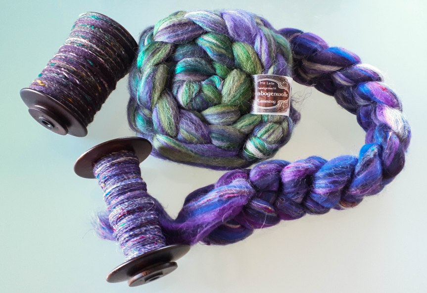 In meinem gut sortierten Spinnfaser-Vorrat haben sich zwei wunderschöne Kammzüge von der lieben Regenbogenwolle aufgetan, die ich vor einiger Zeit mal bei ihr gekauft habe. Sie erschienen mir gerade zu perfekt als Kombipartner für das schöne Batt von Baltic-Faser.