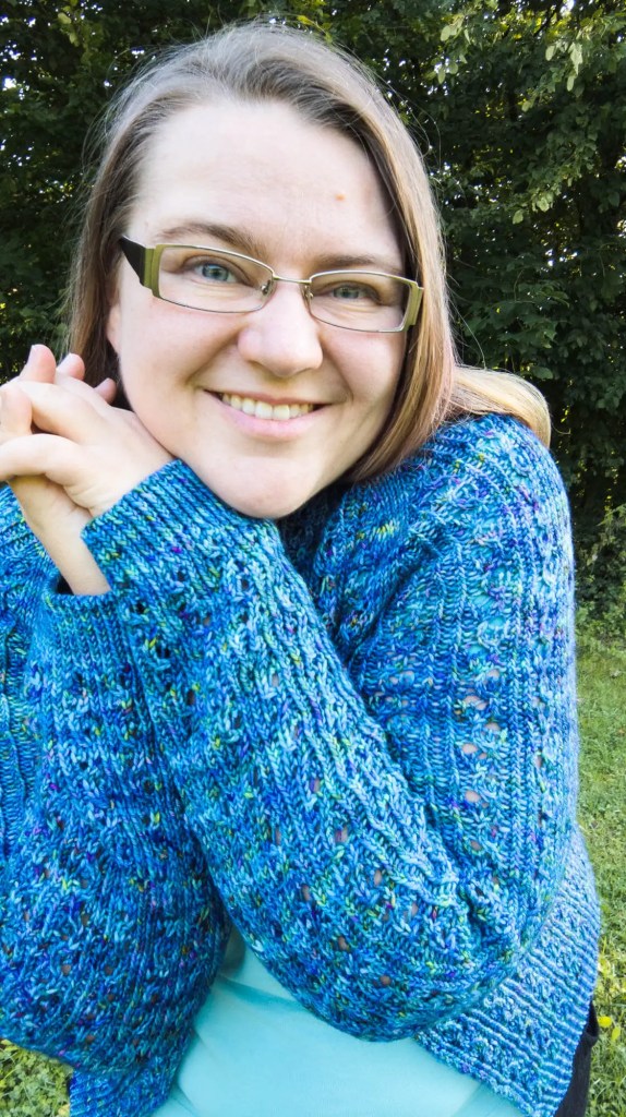 Im Original ist dieser Cardigan in meiner neuen Garnbasis Blue DK gestrickt. Die neue handgefärbte Wolle in DK-Stärke in meinem Shop. DK ist kurz für Double Knit und meint doppelt so dick wie klassische 4fädige Sockenwolle.