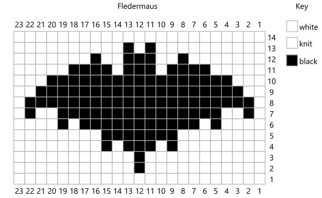 Für die Fledermaus muss man mit der neuen Hauptfarbe in der kommenden glatt rechten Runde 5 Maschen gleichmäßig verteilt zunehmen. Ab dann strickt man nach dem Chart der Fledermaus. Der Chart wird dabei dreimal hintereinander gestrickt.