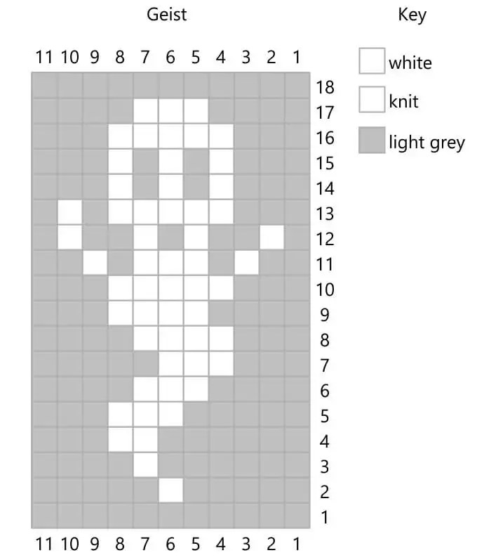 Für den Geist habe ich zunächst eine Runde glatt rechts in der nächsten Hauptfarbe gestrickt. Danach wird der Chart 6x in der Runde gestrickt, dabei werden nach je zweimal Chart eine zusätzliche Masche in der Hauptfarbe gestrickt.