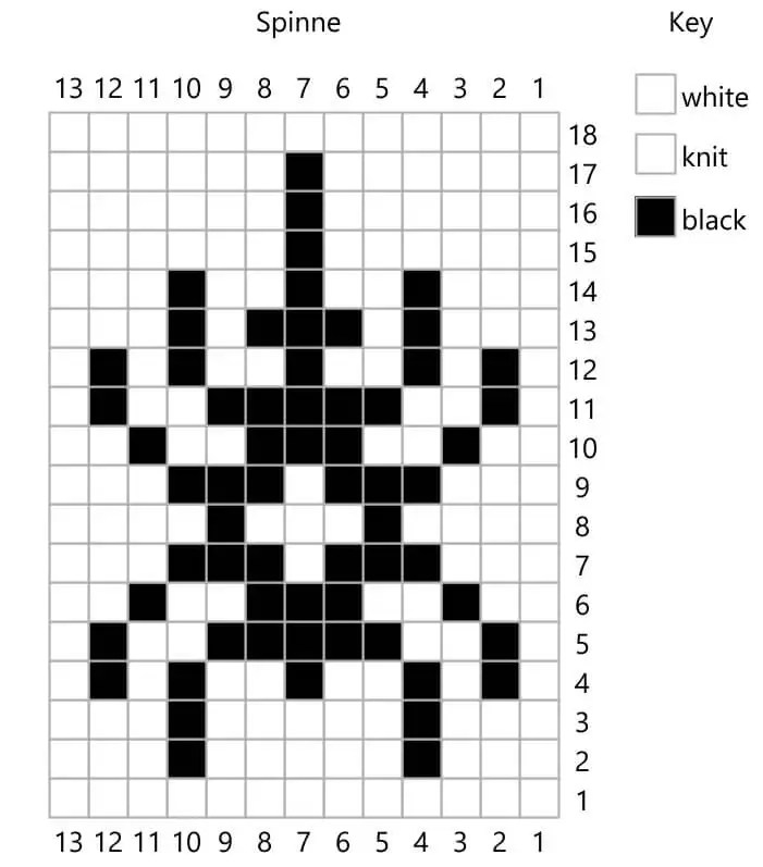 Für die Spinne wie gewohnt eine Runde glatt rechts mit der neuen Hauptfarbe stricken. Danach passt der Chart 5x in die Runde. Und wie bereits beim Kürbis brauchst du eine zusätzliche Masche in der Hauptfarbe nach der 1., 2., 3. und 4. Chartwiederholung.