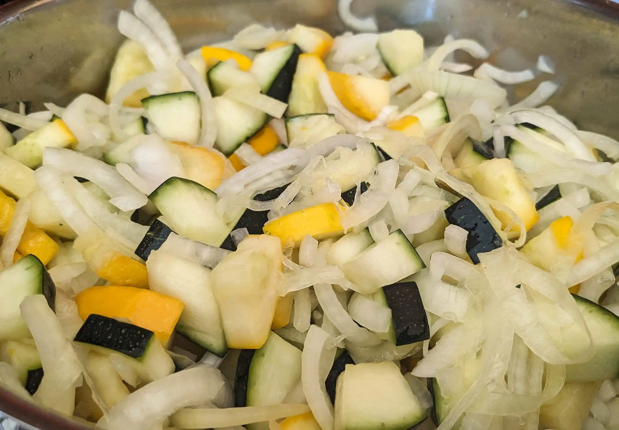 Für die Sauce schneide ich gut gereifte Tomaten und Zucchinis in Stücke. Die Größe der Stücke ist nicht so wichtig, da das ganze nun lange gekocht wird und am Ende püriert wird, damit eine leckere Sauce entsteht. Außerdem schneide ich eine oder mehrere Zwiebeln klein.