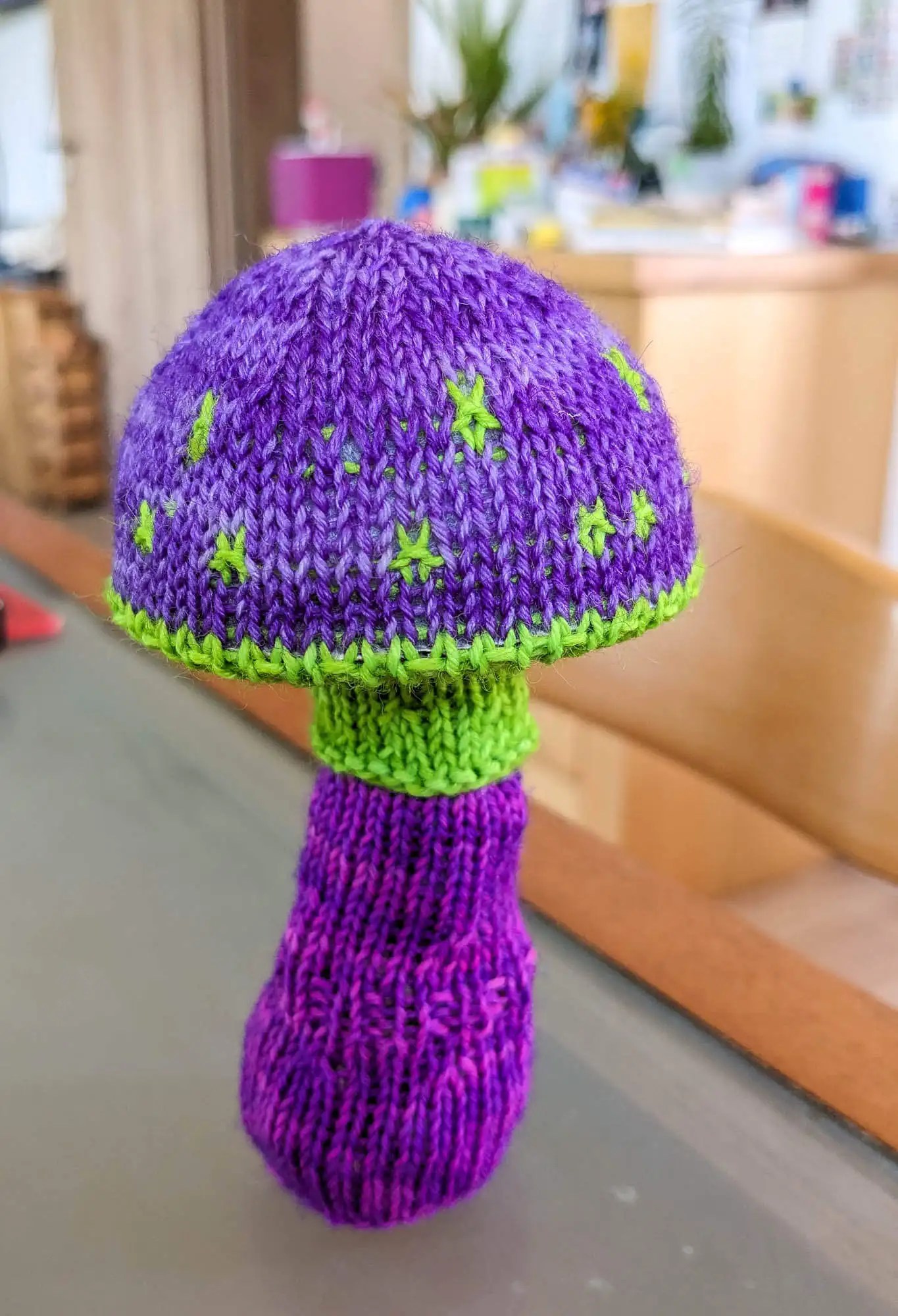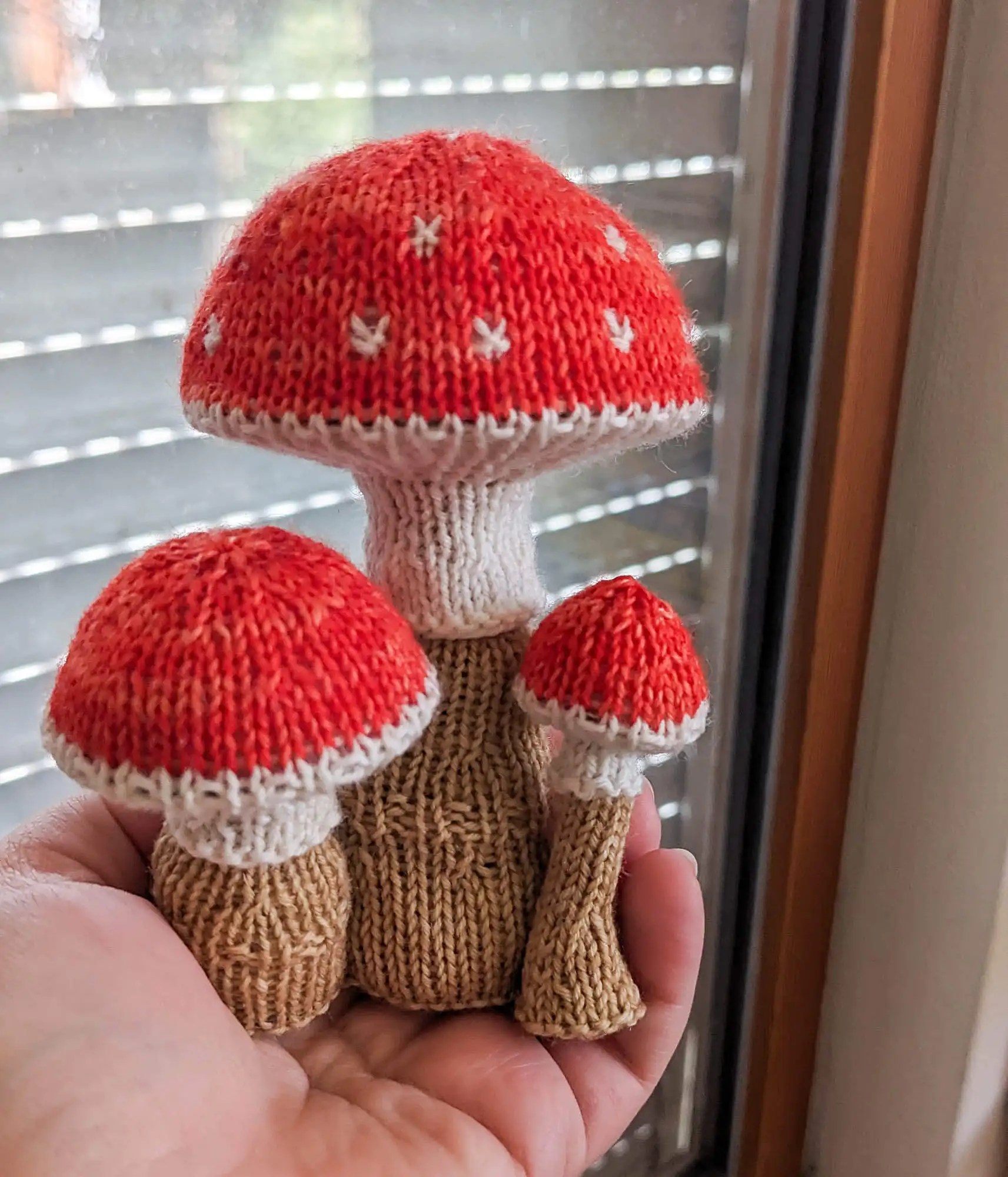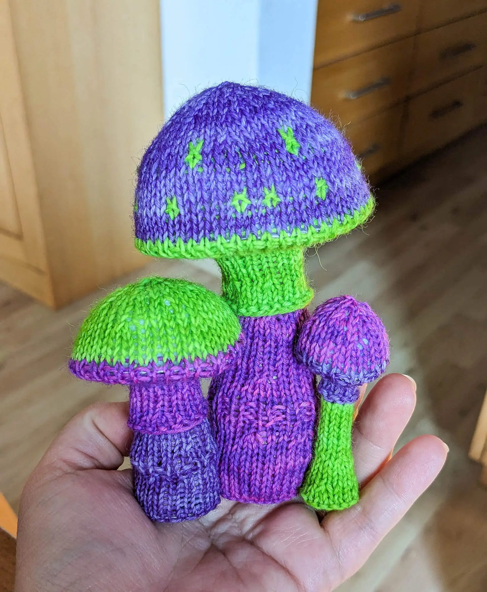 Im August fangen bei mir traditionell die Herbstgefühle an. Kein Wunder, dass ich endlich wieder Lust zum Pilze stricken hatte. Das Fliegenpilztrio hat ja auch nur seit ca. einem Jahr auf den ganz kleinen Bruder gewartet. Die größeren beiden hatte ich schon 2024 gestrickt. Aber da ich nun schon in Fahrt war, hab ich direkt noch das Magic Mushroom-Trio hinterher gestrickt. Hier fand ich es lustig, mehr mit den Farben zu spielen. So ist bei jedem Pilz die Farbreihenfolge anders. Passt doch zu psychodelischen Pilzen, oder?