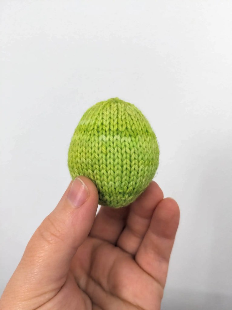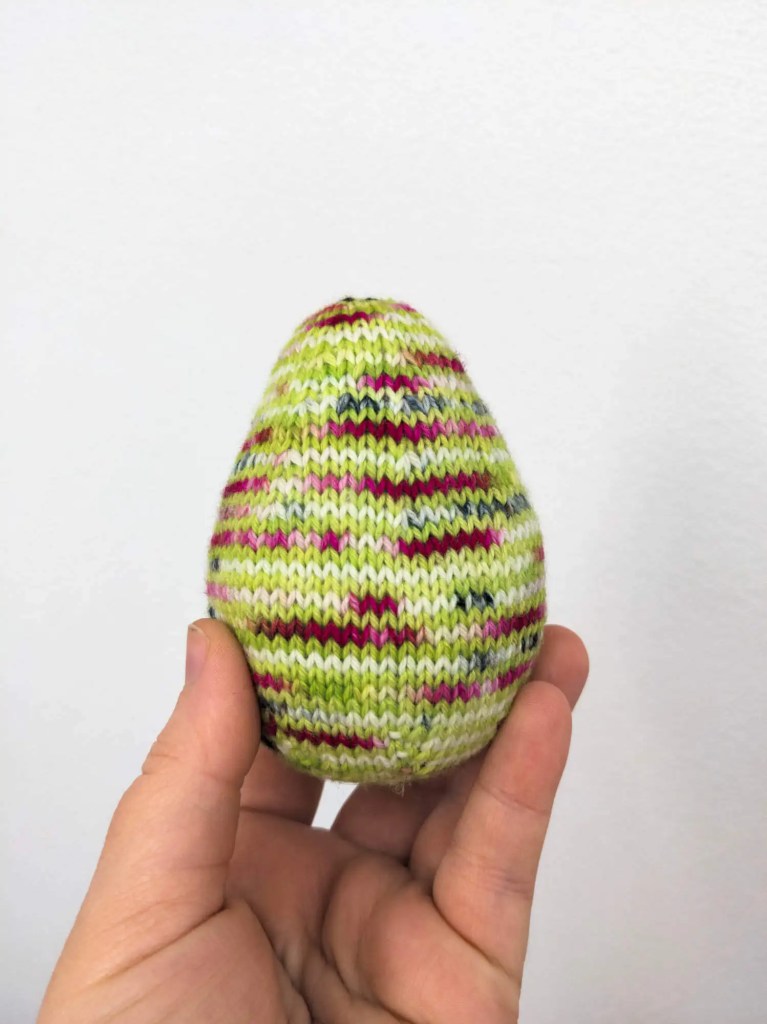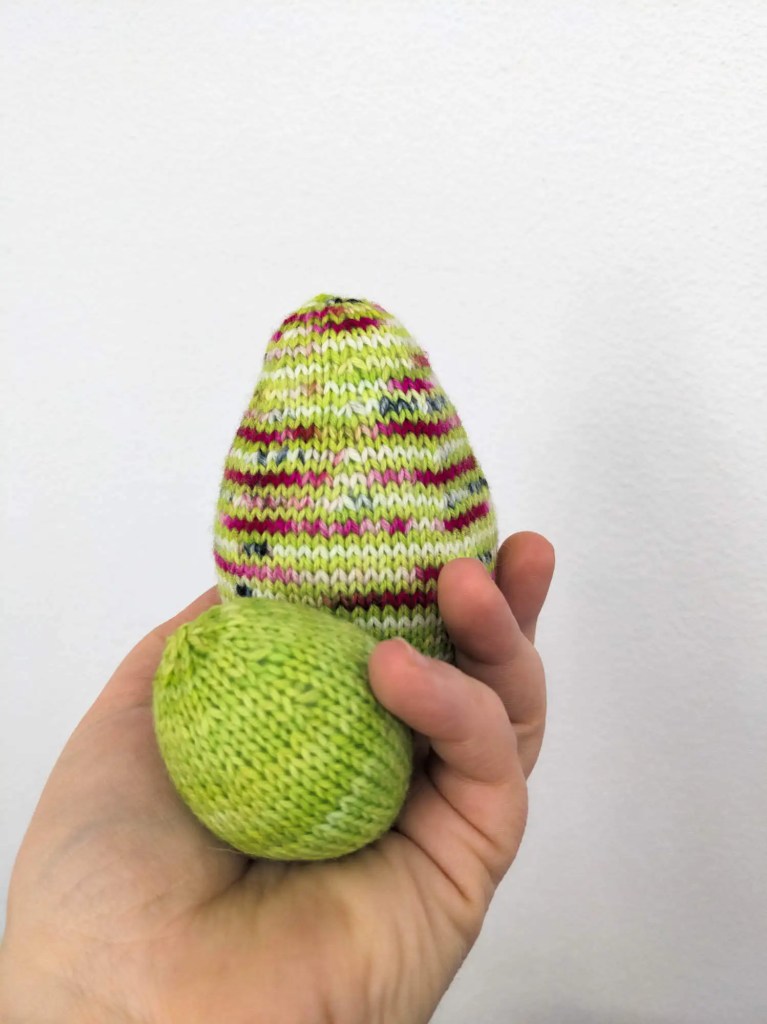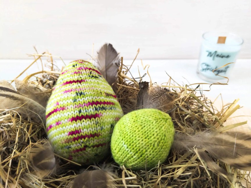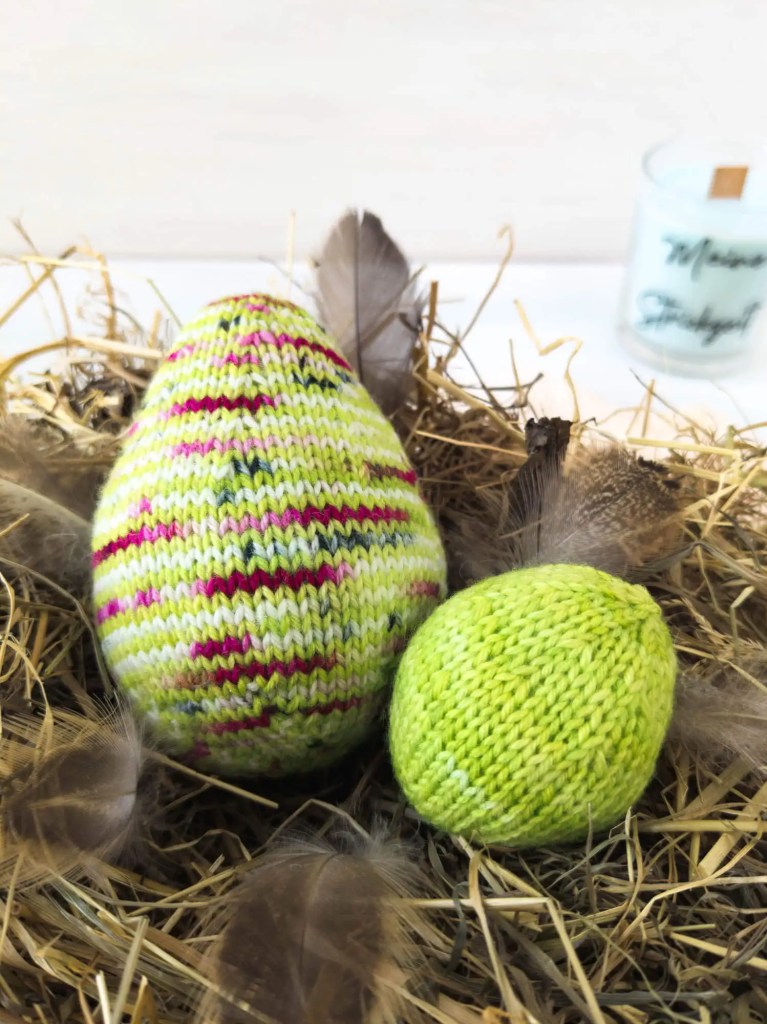 - Alternierend stricken: Nimm zwei Farben, die farblich gut harmonieren und verstricke sie abwechselnd je eine Runde. Das größere Ei habe ich zum Beispiel mit dieser Methode gestrickt.