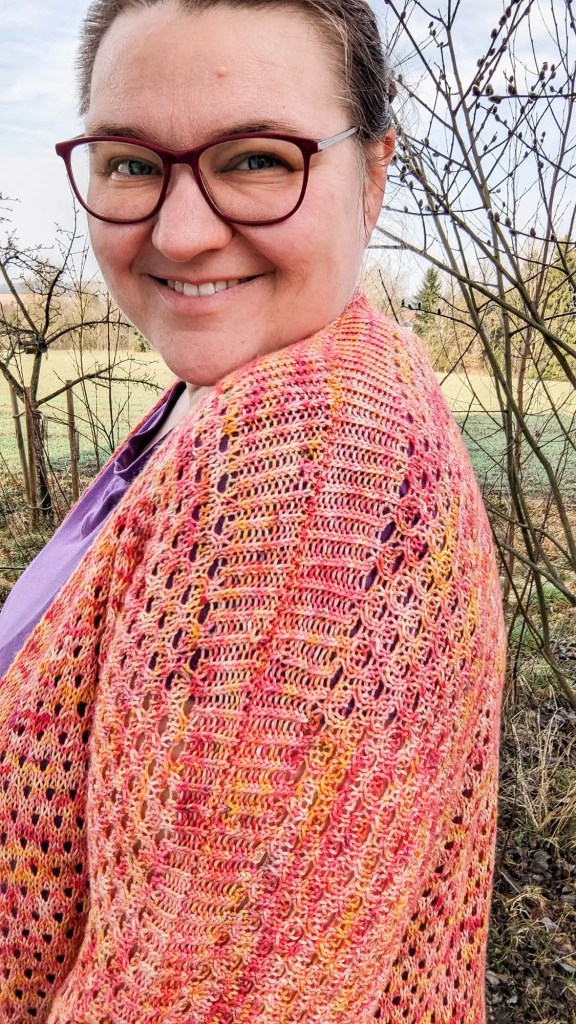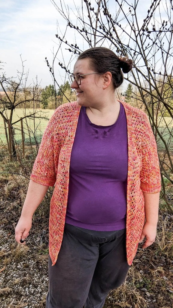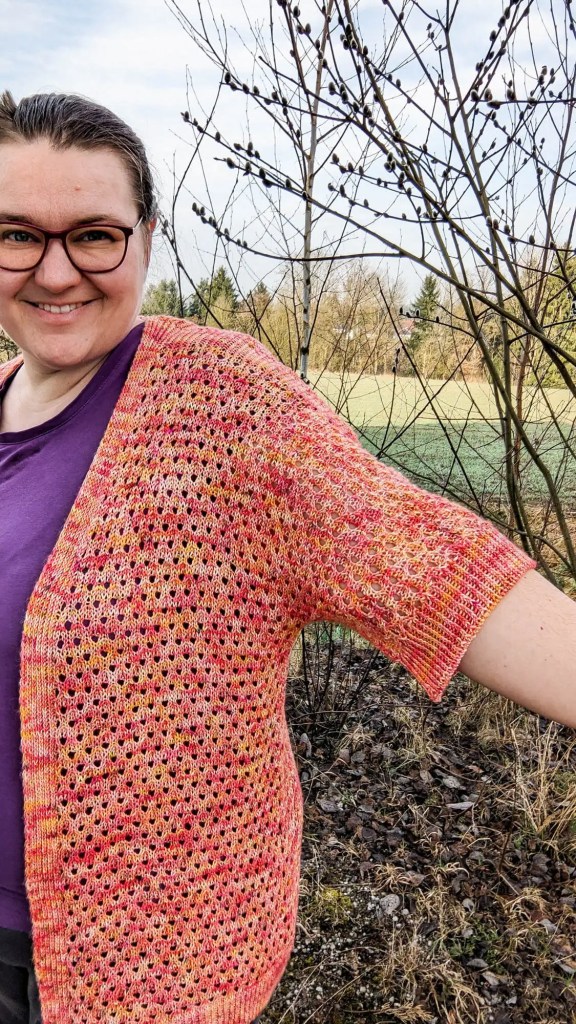 Ich liebe dieses Design, auch wenn ich eigentlich ja kein großer Fan von kurzärmeligen Cardigans bin. Ich trage eine Strickjacke, wenn mich friert oder mindestens fröstelt und da sind lange Ärmel dann doch Pflicht. Aber auch, wenn ich tatsächlich anfangs skeptisch war, ob mir diese Konstruktion gefallen würde, bin ich nun vollends überzeugt. Gerade im Sommer über ein dünnes Sommerkleid oder über ein Spaghettiträger-Top kann ich es mir super gut vorstellen!